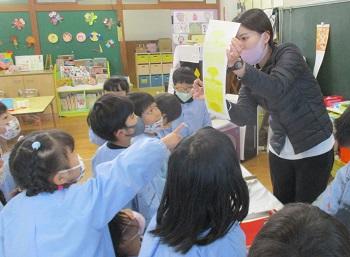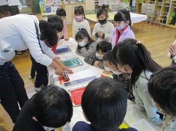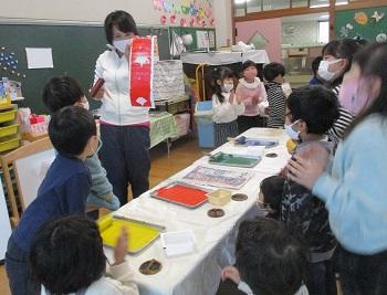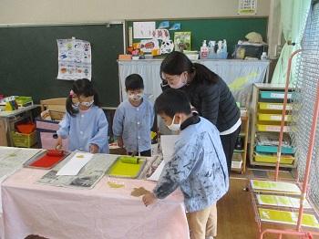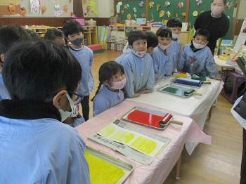 年長組は版画遊び「葉っぱのローラー」をしました。まず先生がやって見せ、子供たちの興味関心を高めます。
