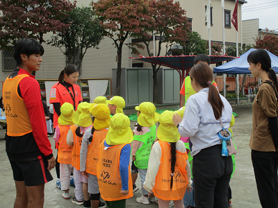 さっそくサッカーを始める前に、元気よく園庭を走りました。ウサギに変身したり、飛行機になって走りました。