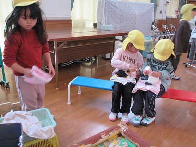 年少たんぽぽ組は、保育室で焼き芋ごっこを楽しんでいます。秋を感じながら、自分たちでお芋を焼いています。