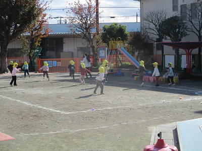 園庭では、みんなで「あーぶくたった 煮え立った♬」「おにが来た~!」年長すみれぐは、逃げるのも早いです。